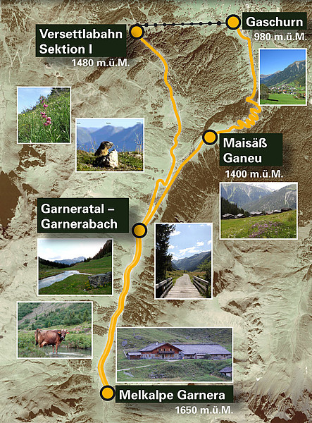 Programm: Wanderung von der Mittelstation der Versettla Bahn durch das Garneratal bis zur Melkalpe Garnera, über den Maisäß Ganeu hinunter nach Gaschurn